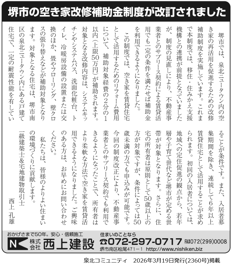 ( 3月19日) 堺市の空き家改修補助金制度が改訂されました【新着】